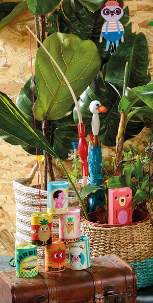 Poďme sa hrať na Indiánmi. Škatuľa sa pri rozložení stáva terčom na strieľanie, balenie obsahuje drevený lúk a 3 šípy s farebnými prísavkami. Vyrobené vo Francúzsku. Hlavné vlastnosti: trénuje presnosť a koordináciu pohybovvyrobené vo Francúzsku