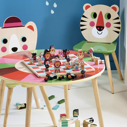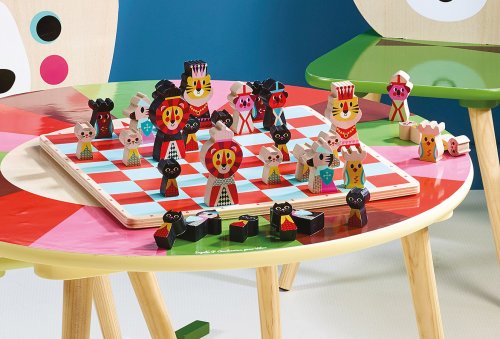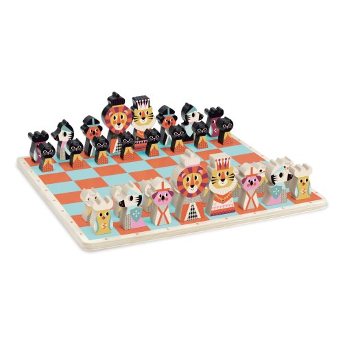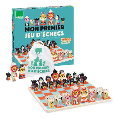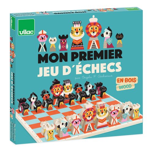 Farebný šach pre najmenších s drevenými figúrkami zvierat. Ľahko upútajú pozornosť detí a tie si tak ľahšie osvoja princíp hry. Figúrky sú uložené v látkovom vrecúšku. Balenie obsahuje 32 dielikov. Ilustrované Ingelou P. Arrhenius . Hlavné vlastnosti: drevená herná doska aj figúrkyfarebná hra stimuluje zmysly detídesign Ingelou P. Arrhenius Návod hryObsah hry: herný plán16 čiernych a 16 bielych šachových figúrokbavlnené vrecúško Dvaja hráči, "čierny" a "biely" majú vedľa svojho kráľa 15 ďalších figúrok: dámu strelca, 2 jazdcov, 2 veže a 8 pešiakov. Štartovacia pozícia: Na začiatku hry sa dieliky rozostavia ako na obrázku č. 1, ktorý nájdete v originálnom návode v balení. Kráľ vždy stojí na poli E, kráľovná na poli D. Začína biely hráč, potom sa hráči na ťahu striedajú po jednom ťahu . Hráč sa nikdy nemôže svojho ťahu vzdať. Žiadnym ťahom sa figúrka nesmie presunúť na políčko, na ktorom už stojí iná figúrka rovnakej farby. Figúrky sa pohybujú vždy na prázdne miesta, výnimkou je len branie súperovej figúrky. V tomto prípade hráč postaví svoju figúrku na miesto vzatej figúrky súpera. Jazdec je jediná figúrka, ktorá môže preskakovať ostatné figúrky. Brané súperove figúrky spočíva v tom, že sa táto figúrka odstráni políčka a na rovnaké políčko sa postaví figúrka, ktorá ju vzala . Cieľom hry je dať šach-mat kráľovi oponenta . keď nejakým ťahom napadnete súperovho kráľa, tzn. presuniete figúrku tak, že by potenciálne budúcim ťahom mohla kráľa brať, tomuto sa hovorí šach. Pokiaľ taká situácia nastane, je súper povinný hrať tak, aby túto hrozbu odvrátil. Napr. ťahať kráľom na políčko, ktoré nie je napadnuté alebo pred kráľa postaviť inú figúrku a tým odvrátiť útok alebo napadajúci kameň zobrať. Ak neexistuje žiadny ťah, ktorý by vyhovoval pravidlám, znamená to mat alebo šach-mat, tzn. koniec hry a víťazstvo hráča, ktorý dal mat. Podľa pravidiel sa figúrka kráľa nedá vziať, pri šach-mate sa preto pokladá ležmo na hraciu dosku. Ako sa pohybujú jednotlivé dieliky: Hra je zaujímavá tým, že sa každá figúrka pohybuje inak. KráľMôže sa pohybovať o jedno políčko do všetkých smerov, samozrejme nie na políčka, ktoré sú ohrozované figúrkami spoluhráča. Dvaja králi nikdy nemôžu byť na susedných poliach. Cieľom hry je dať šach kráľovi protihráča. Kráľ nemôže byť nikdy vzatý. Pokiaľ niektorý hráč napadá oponentovho kráľa, musí ho upozorniť vyslovením slova „šach“. DámaJe najsilnejšou figúrkou, pretože sa môže pohybovať do všetkých strán, o ľubovoľný počet polí. Nesmie pri tom ale preskočiť inú figúrku. JazdecJazdec sa nepohybuje v priamke, ako ostatné figúrky, ale z jedného políčka na druhé, v tvare písmena L. Môže preskakovať vlastné aj oponentove figúrky. Pri pohybe sa najprv posunie o dve políčka dopredu, dozadu, doľava alebo doprava a potom o jedno políčko doľava, doprava, hore alebo dole, aby tak okopíroval svojim pohybom písmeno L. Nikdy však diagonálne. Pozri obrázok v návode. StrelecPohybuje sa a berie figúrky v diagonálach. Môže sa pohybovať o koľko polí chce, ale pri každom ťahu iba v jednom smere. Nesmú preskakovať figúrky. Z pohybu po diagonálach vyplýva, že žiadnym ťahom nemožno zmeniť farbu políčka, na ktorom strelec stojí. VežaPohybuje sa horizontálne a vertikálne v akejkoľvek vzdialenosti. Zo svojho políčka sa môže presunúť na také, ktoré je buď v rovnakom rade alebo rovnakom stĺpci. Nesmie však preskočiť žiadnu figúrku, ktorá by stála v ceste. PešiakPohybuje sa o jedno políčko vpred, okrem prvého ťahu, kedy sa môže, ak chce, posunúť o dve políčka vpred. Pešiak sa pohybuje iba vertikálne, výnimkou je branie súperových figúrok, vtedy sa pohybuje diagonálne, ako strelec. Vždy však o jedno políčko. Akonáhle sa pešiak dostane na 8. políčko - súperovu základňu, musí sa "premeniť" na inú figúrku, podľa rozhodnutia hráča, a to na takú figúrku, ktorá bola vzatá súperom. Kráľovná je najlepšou voľbou, ak už bola vzatá. Švédska umelkyňa Ingela Peterson Arrhenius sa narodila v roku 1967. Umenie a dizajn mali vždy miesto v jej živote a než začala jej kariéra ilustrátorky, Ingela pracovala ako umelecká vedúca v Štokholme. Potom študovala reklamný a grafický dizajn na umeleckej škole aj v Štokholme. V roku 1992 začala podnikať ako ilustrátorka na voľnej nohe a pracovala medzinárodne naprieč reklamou, dizajnom, vydavateľstvom… V minulosti vytvárala tlačové vzory pre tkaniny, tapety, papiernictvo, taktiež pracovala na obaloch, produktovom dizajne, bytových doplnkoch a hračkách. Jej plagáty a designové hračky nájdete po celom svete. Má vášeň pre retro štýl, čo je jasne vidieť na ich dieloch a taktiež v jej nadšení pre typografiu a farby. Teraz žije v Štokholme s manželom a 2 synmi.