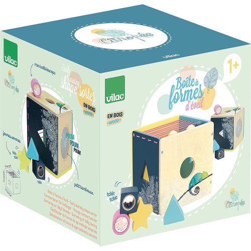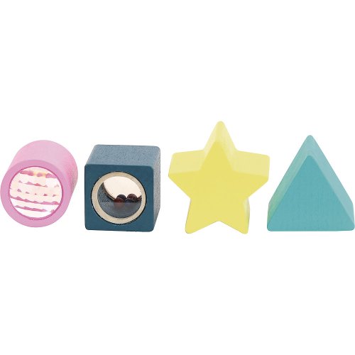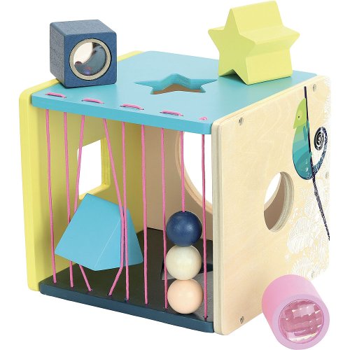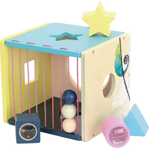 Vkladacia drevená kocka s 4 rôznymi tvarmi. Kaleidoskopický valec, zvuková kocka, hviezdička a trojuholník pomôžu rozvíjať jemnú motoriku, senzorické funkcie a poznávanie farieb pri vkladaní do príslušných otvorov motorickej kocky. Z jednej strany má kocka pružné šnúrky s korálkami. Hlavné vlastnosti: moderné originálne designové herné prvky v podobe senzorických kociek a pružných šnúrok rozvíja motoriku, senzorické funkcie a poznávanie farieb.