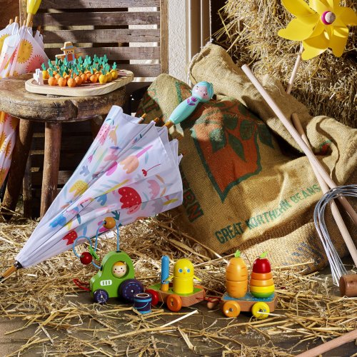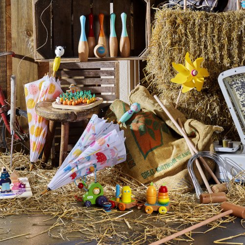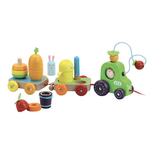 Skladacia hruška ukrýva červíka, králik je schovaný v mrkve, vtáčiky pípajú, vedierko s kukuricou štrká ako rumba gule a traktor má posuvné korálky na drôtiku v tvare ovocia. Hračka, ktorá rozvinie predstavivosť, motoriku a zvedavosť Vašich detí. Hlavné vlastnosti: vysoká variabilita vyrobené ekologicky, šetrne k životnému prostrediu