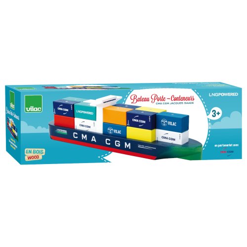 Farebná drevená nákladná loď s magnetickými kontajnermi je replikou lode Jacques Saadé, prvej lode využívajúcej na pohon kvapalný zemný plyn (LNG). Hračka bola vyrobená v spolupráci s čelnou francúzskou prepravnou spoločnosťou CMA CGM. Je súčasťou Vilacity kolekcie a je so všetkými jej súčasťami plne kompatibilná, ďalšie samostatné rozšírenia prinesú variabilitu a prehĺbia zážitok z hry. Hlavné vlastnosti:loď a 18 kontajnerovmagnetické spojeniakompatibilné so všetkými súčasťami Vilac Vilacity kolekcievyrobené ekologicky, šetrne k prostrediu V2357 – Prístavný žeriav Vilacity (nie je súčasťou sady, nájdete v našej ponuke): V2358 – Nákladné auto Vilacity (nie je súčasťou sady, nájdete v našej ponuke) : Príklad zostavy lode s ďalšími súčasťami kolekcie Vilacity: