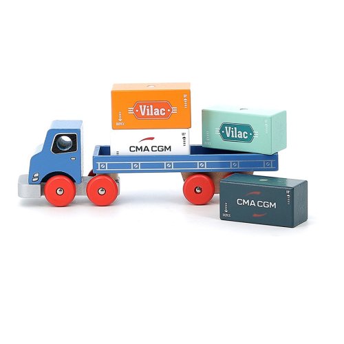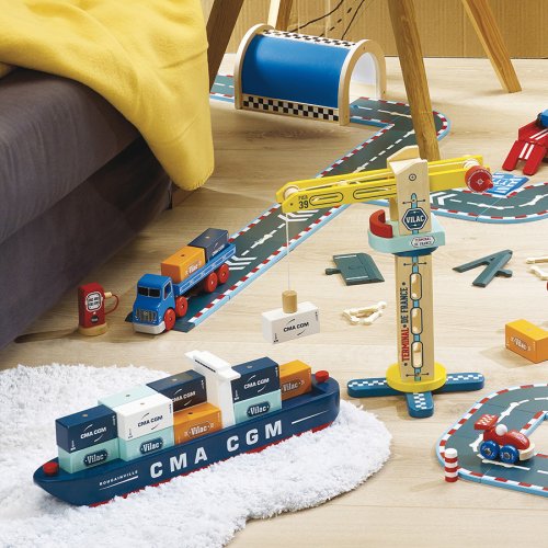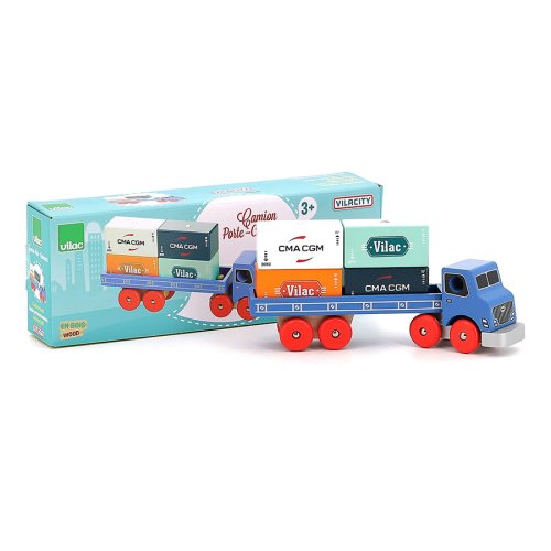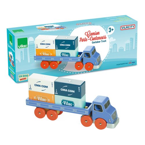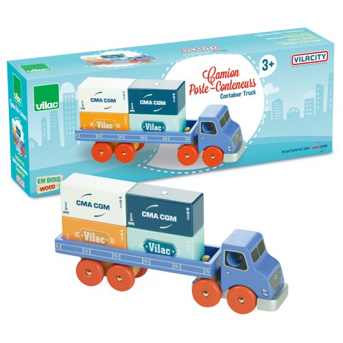 Drevený ťahač s prívesom a magneticky spojenými kontajnermi, vyrobený v spolupráci s čelnou fracúzskou prepravnou spoločnosťou CMA CGM. Je súčasťou Vilacity kolekcie a je so všetkými jej súčasťami plne kompatibilná, ďalšie samostatné rozšírenia prinesú variabilitu a prehĺbia zážitok z hry. Hlavné vlastnosti:ťahač, príves a 4 kontajnerymagnetické spojeniakompatibilné so všetkými súčasťami Vilac Vilacity kolekcievyrobené ekologicky, šetrne k prostrediu V2357 – Prístavný žeriav Vilacity (nie je súčasťou sady, nájdete v našej ponuke): V2356 – Nákladná loď Vilacity (nie je súčasťou sady, nájdete v ponuke): V2356S – Nákladná loď Jacques Saadé Vilacity (nie je súčasťou sady, nájdete v našej ponuke): Príklad zostavy nákladného auta s ďalšími súčasťami kolekcie Vilacity: