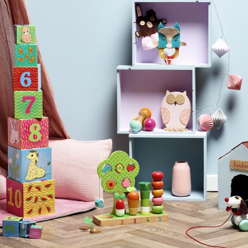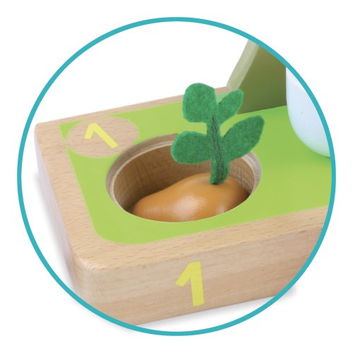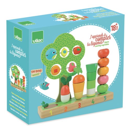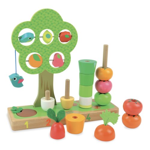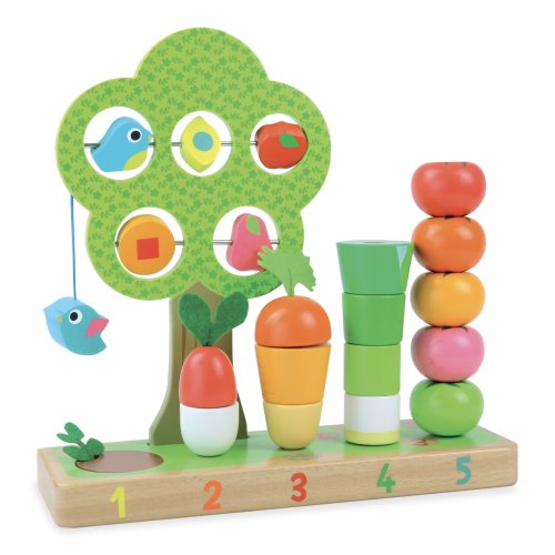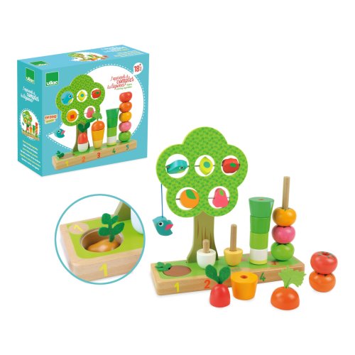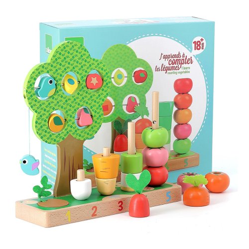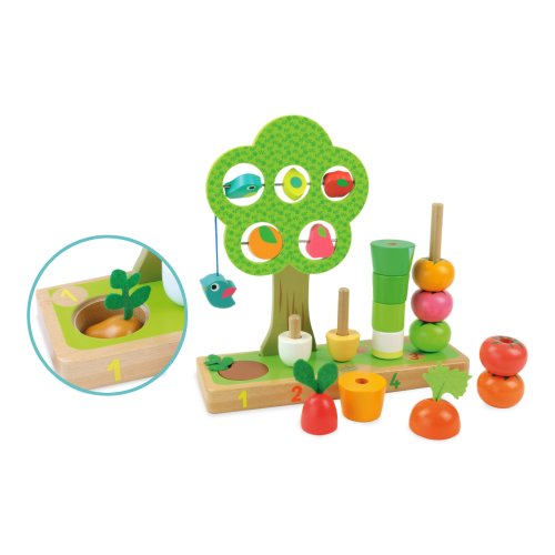 Hra, ktorá prebudí zmysly detí je ideálna na učenie počítanie a rozoznávanie tvarov. Táto drevená hračka sa skladá zo základnej dosky, zeleniny a stromu s otočnými dielikmi. Zelenina obsahuje napríklad mrkvu, pór a paradajky. Zeleninu a jej dieliky deti navliekajú na drevené tyče. Najvyššia z tyčí je upevnená na povrázku, v prípade pádu dieťaťa na nej, sa tyč odkloní. Hračka je certifikovaná pre vek 1,5+. Hlavné vlastnosti: bezpečná a zábavná hračka rozvíja logické myslenie a motoriku dieťaťa krásny dizajn, jemné farby upútajú pozornosť dieťaťa
