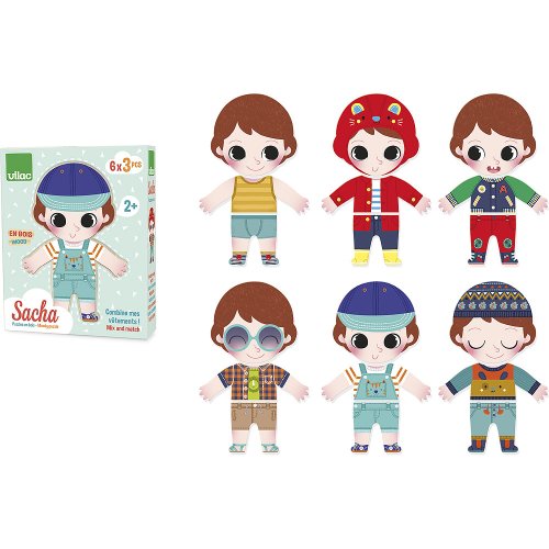 Užite si so Sachou zábavu pri obliekaní. Balenie obsahuje 6x3 kusy oblečenia, ktoré môžete ľubovoľne kombinovať, vkladať do výrezu hornej časti dreveného boxu. Hlavné vlastnosti: praktický box na uloženie obsahuje 18 dielikov oblečenia podporuje kreativitu