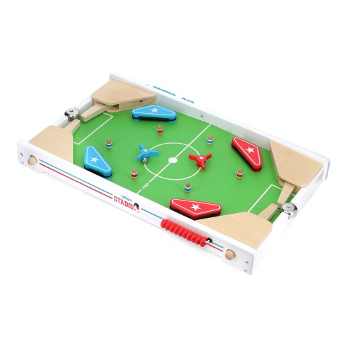 Ovládajte pálky pomocou tlačidiel a pokúste sa cez ihrisko s množstvom prekážok streliť súperovi gól v jedinečnej stolnej hre kombinujúcej futbal a pinball. Bránky sú vybavené malými zvončekmi a hrá sa kovovými guličkami, inkasovaný gól tak vždy oznamuje prenikavé zazvonenie. Po stranách hracieho stola sú umiestnené počítadlá pre zaznamenávanie priebehu zápasu. Odolné drevené prevedenie zo silnej preglejky zaisťuje dlhú životnosť. Hlavné vlastnosti: hrací stôl a 3 guličky atraktívne a odolné drevené spracovanie