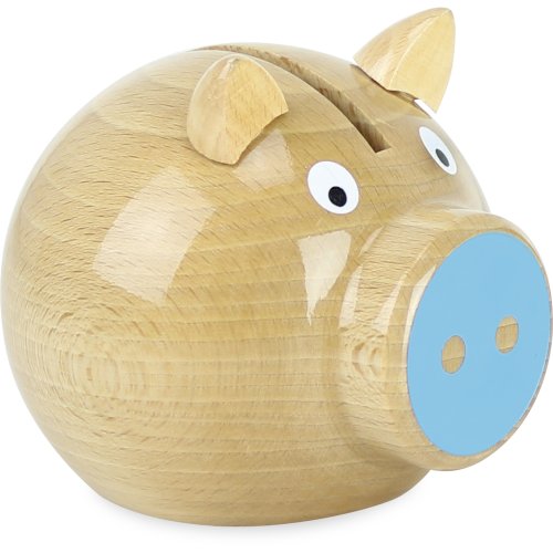 Pokladnička v tvare roztomilého prasiatka v prírodnej farbe s modrým rypákom. Vyrobené vo Francúzsku z lakovaného dreva. Hlavné vlastnosti: vyrobené vo Francúzsku