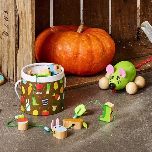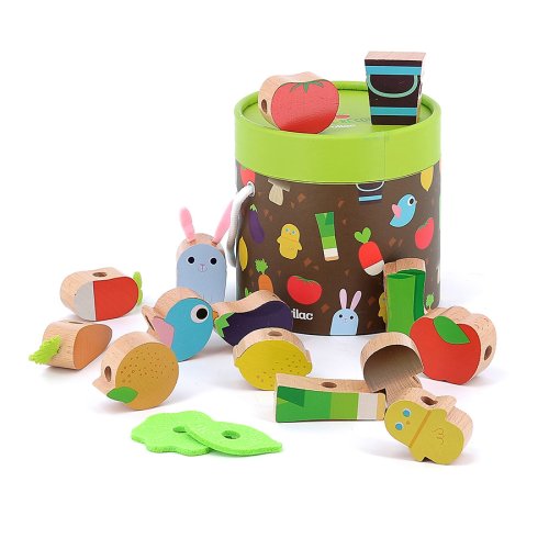 Krásna prevliekanka v motíve farmy. V kompaktnom balení nájdete 14 ilustrovaných drevených korálikov (napr. baklažán, paradajka, vtáčik, gumáky), ktoré deti môžu navliekať na textilnú šnúrku. Hračka pomáha s rozvojom jemnej motoriky. Vybavené bezpečnostnými sponami. Vhodné od 18 mesiacov. Hlavné vlastnosti: 14 korálikovvyrobených ekologicky, šetrne k životnému prostrediu