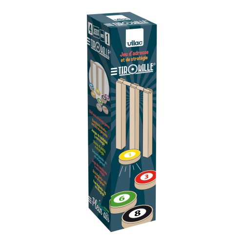 Hľadáte novú zábavu na svoju malú párty? Jedinečný mix kolkových, pétanque a shuffleboard hier je výzvou pre Vašu zručnosť a strategické myslenie. Hra vyniká variabilitou a je možné ju hrať podľa niekoľkých rôznych pravidiel. Budete sa pokúšať prekážku zraziť, priblížiť sa k nej čo najtesnejšie, alebo jej prejsť? Vyskúšajte a rozohrajte postupne všetky možnosti! Odolné prevedenie z masívneho dreva zaistí dlhú životnosť. Súčasťou balenia je praktické bavlnené vrecko pre ľahké upratovanie a prenášanie. Hlavné vlastnosti: 8 číslovaných pukov, 2 špeciálne puky a 4 dielna prekážka pre 2–8 hráčov 4 herné varianty robustné a odolné prevedenie z masívneho dreva praktické balenie Skrátený návod hry: Hráči sa rozdelia do 2 tímov. Pri hre stojí asi 3 m od bránky, ktorá sa skladá z 2 alebo 3 drevených tyčiek a 1 alebo 2 priečne vyrezávaných drievok. Pri hode majú nohu položenú na puku „Tirokille“. V plnom návode nájdete pravidlá pre 4 verzie hry, mierne sa líšia, avšak cieľom je väčšinou prehodiť puky bránkou. Boduje sa väčšinou podľa bodového ohodnotenia daného puku a blízkosti alebo úspešnosti hodu.