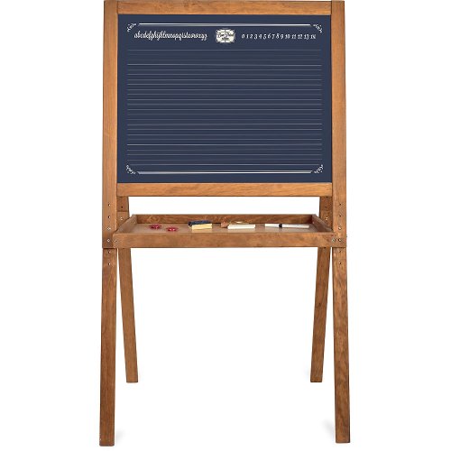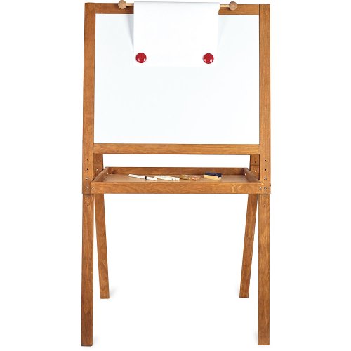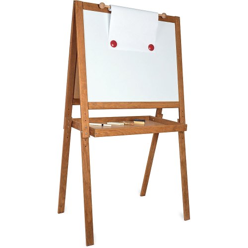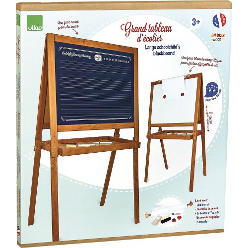 Veľká drevená tabuľa, má jednu stranu čiernu na písanie kriedou a druhú bielu na fixy a magnetky. Pod tabuľou je tiež doska na uloženie fixiek, kriedy... Tabuľa má nastaviteľnú výšku, maximálne však 120 cm. Vyrobené vo Francúzsku. Hlavné vlastnosti: magnetická tabuľa na fixy aj kriedyvyrobené vo Francúzsku výška 120 cm