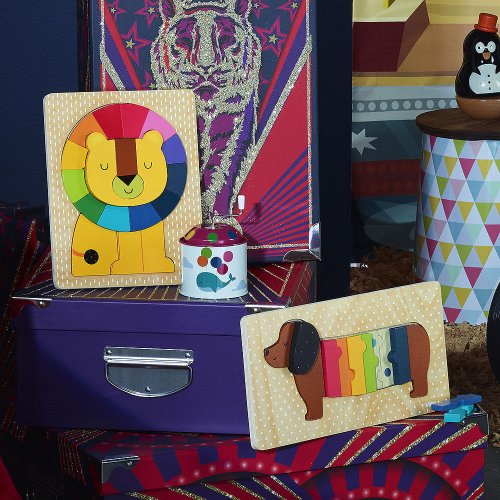 Vkladacie puzzle s motívom leva s farebnou hrivou. Na základnej doske sú miesta na vloženie dielikov farebne rozlíšené, aby deti mohli ľahšie vložiť dielik na správne miesto. Učia sa tak nielen jemnej motorike, ale aj rozpoznávaniu farieb a tvarov. Malé deti tak môžu ľahko uchopiť robustné drevené kúsky a vytvoriť tak svojho malého levieho kamaráta. Hlavné vlastnosti: obsahuje 17 dielikov rozvíja senzomotorické vlastnosti detí design Andy Westface Andy Westface je ilustrátor žijúci a pôsobiaci v Hongkongu. Svojou prácou sa snažia sprostredkovať silné pocity a jasné myšlienky za pomoci jednoduchých tvarov, kompozícií i farebnosti. Typickými prvkami jeho diel sú zvieratá a dúha, ktoré si obľúbil pre ich čistotu, úprimnosť a schopnosť vzbudzovať radosť.