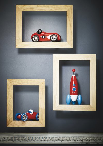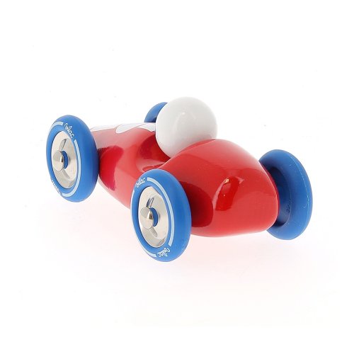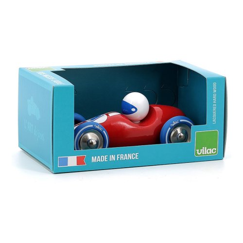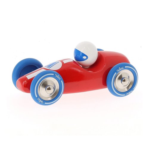 Červené závodné auto vyrobené z lakovaného dreva s kovovými pogumovanými kolesami. Je vhodné ako na hranie tak ako dekorácia do izieb detí či dospelých. Vyrobené vo Francúzsku. Hlavné vlastnosti: vyrobené vo Francúzsku
