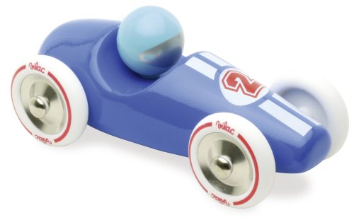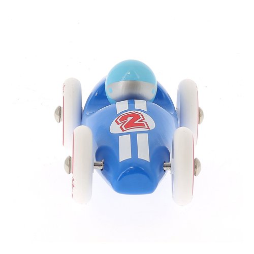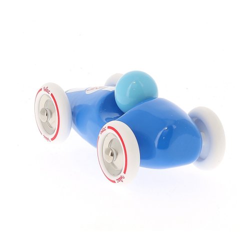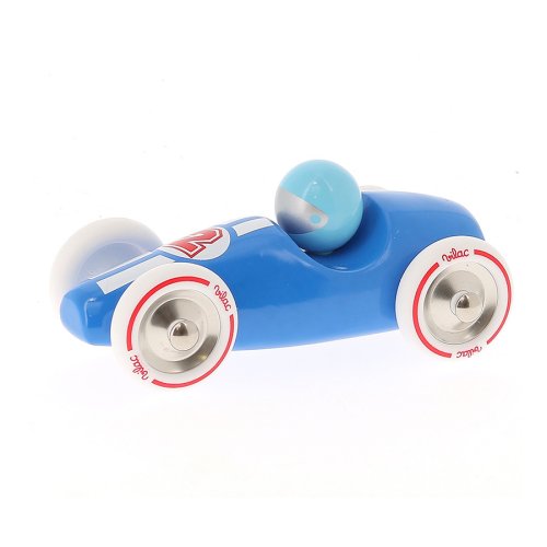 Modré závodné auto vyrobené z lakovaného dreva s kovovými pogumovanými kolesami. Je vhodné ako na hranie tak ako dekorácia do izieb detí či dospelých. Vyrobené vo Francúzsku. Hlavné vlastnosti: vyrobené vo Francúzsku