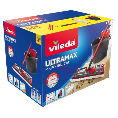 Set v krabici obsahuje Ultramax mop a vedro so žmýkacím košom Vhodný pre všetky typy podláh - PVC, plávajúce podlahy, parkety, dlažba Úplne nová technológia žmýkania power press Unikátny systém lamiel znižuje námahu pri žmýkaní o 30%.