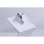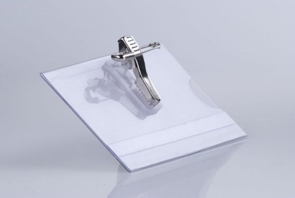 Tuhé číre visačky CT 123 z PVC materiálu sú opatrené poistným špendlíkom a svorkou „krokodíl“. Vnútri nich je papier o veľkosti 60 x 90 mm , na ktorý môžete písať mená.