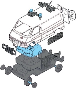 Model Renault Trafic MS 27 Police v mierke 1:35 je plne vybavená policajná dodávka. S robustným rámom na kapote, pancierovaním a amplikónmi. Stavebnica patrí do skupiny Basic.