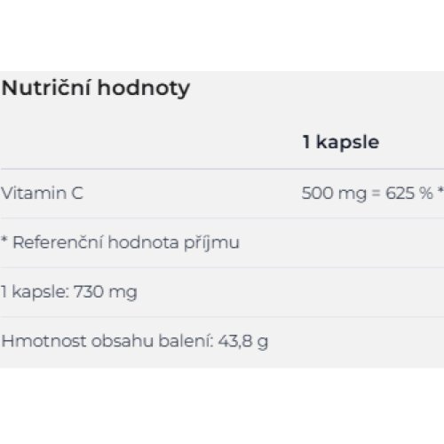 Zloženie: Kyselina L-askorbová (vitamín C), želatínová kapsula (želatína, farbivo oxid železa), maltodextrín, plnidlo stearan horečnatý, protispekavá látka oxid kremičitý.