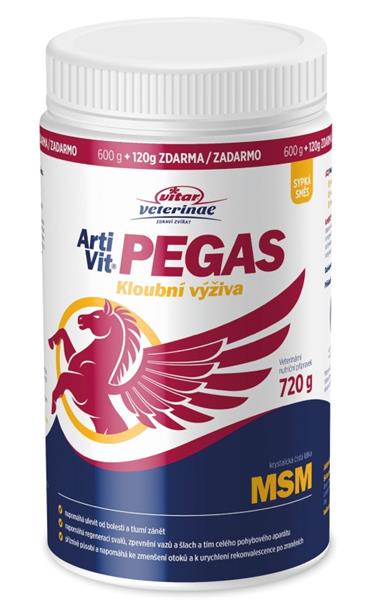 Condroprotektívum pre kone a veľké plemená psov. ArtiVit Pegas MSM obsahuje kryštalickú čistú látku MSM (Methylsulfonylmethan), ktorá obsahuje organicky viazanú síru, ktorý pôsobí na spevnenie šliach a väzov, potláča bolesť a zápaly a pozitívne pôsobí na regeneráciu a relaxáciu svalov. Má tiež silné antioxidačné vlastnosti a je unikátnym zdrojom sírnych zlúčenín, pozitívne pôsobiacich v organizme, najmä v poškodených chrupavkách. Síra je okrem iného zapojená aj do tvorby kolagénu a glukosamínov – základných stavebných látok kĺbových chrupaviek a spojivových tkanív. Možno podávať aj preventívne predovšetkým na regeneráciu a relaxáciu svalov a na spevnenie celého pohybového aparátu.