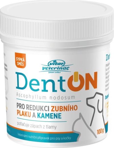 Veterinárny nutričný doplnok na redukciu zubného povlaku a kameňa u psov a mačiek. Prírodný prípravok obsahuje morskú riasu Ascophyllum nodosum pre redukciu zubného povlaku a kameňa, navyše výrazne znižuje zápach z papule u psov a mačiek. Preparát pôsobí priamo v zažívacom trakte zvieraťa, odkiaľ sa následne dostáva do krvného riečišťa, potom do slín a tým veľmi účinne pôsobí na zuby a ďasná. Významne ovplyvňuje schopnosť zachytávania baktérií spôsobujúcich zubný povlak a zmäkčuje existujúci zubný kameň, ktorý väčšinou sám odpadne alebo je veľmi ľahko odstrániteľný. Prípravok vo forme sypkej zmesi neobsahuje umelé farbivá, lepok a cukor. Bez genetických modifikácií. Zloženie: Ascophyllum nodosum Odporúčané dávkovanie: 400 mg 1 odmerka (je súčasťou balenia) Denné dávkovanie: Malé plemená psov do 10 kg a mačky ½ odmerky. Psy od 10 kg do 25 kg 1 odmerka. Psy od 25 kg 2 odmerky. Spôsob použitia: 1x denne primiešajte do bežnej stravy vášho zvieraťa. Prípravok používajte pravidelne. Pokiaľ sa výsledky neprejavia do 4-8 týždňov zdvojnásobte dennú dávku.