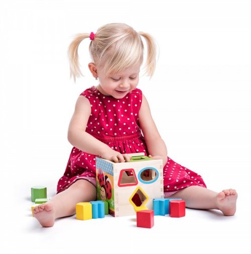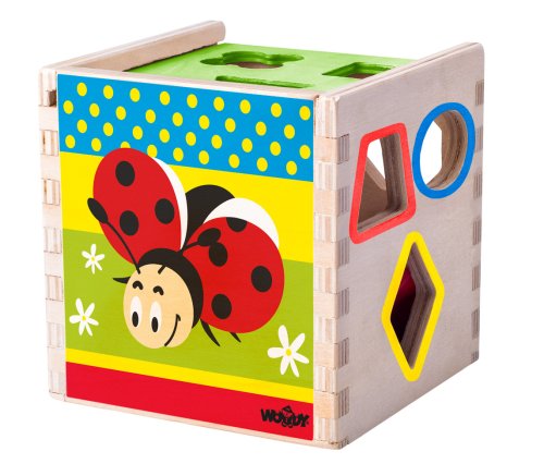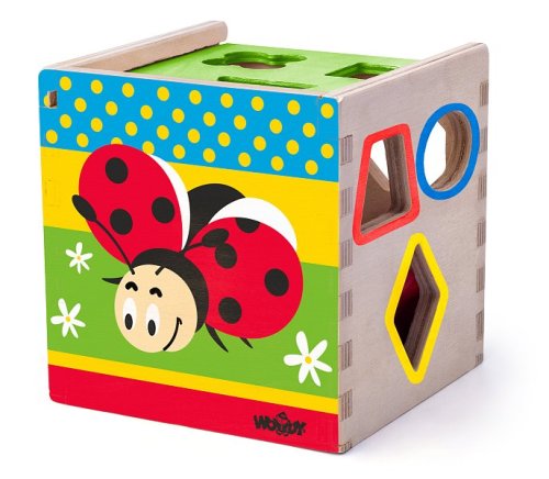Táto vkladacia krabička je vyrobená tak, aby dieťa mohlo prestrčiť daný tvar iba príslušným otvorom. Žiadny z obsiahnutých tvarov neprejde iným otvorom, než ktorým je určené. Pomocníkom pre dieťa budú aj farby. Každý otvor je ohraničený farbou príslušného tvaru. Na veku týchto farebných pomocníkov nenájde a môže to teda skúsiť aj bez nich. Po vložení všetkých tvarov vysunie veko a môže vkladať znova. Vek: 2+ | Rozmer: 13,5 x 13,5 x 14 cm