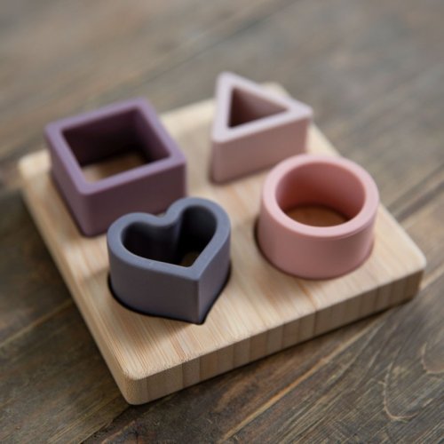 Vkladačka tvorená bambusovou základňou + 4 rôznymi tvarmi vyrobenými z vysoko kvalitného, na dotyk príjemného silikónu.
