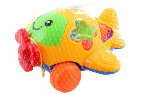 Vkladačka s motívom veselého lietadla. Materiál plast. Súčasťou balenia 5 kociek rôznych tvarov. Rozmery lietadla 20x11x20 cm. Balené v sieťke. Vek 3+