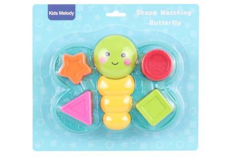Plastová vkladačka v tvare motýľa o rozmere cca 19 x 15 x 8,5 cm. Obsahuje 4 kocky na vkladanie. Rozmer balenia cca 26,5 x 23,5 x 8,5 cm. Vek 18m+