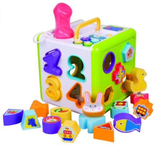 Farebná vkladačka s telefónom a jeho funkciami. Na každej strane kocky sú otvory na vkladanie tvarov, písmen, číslic, zviera tek. Kocka vydáva svetelné aj zvukové efekty, na vrchnej strane má madlo pre lepšie prenášanie a 18 vkladacích dielikov. Rozmer: 18 x 18 x 18 cm, na batérie Vhodná od 12 mesiacov