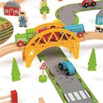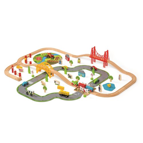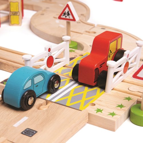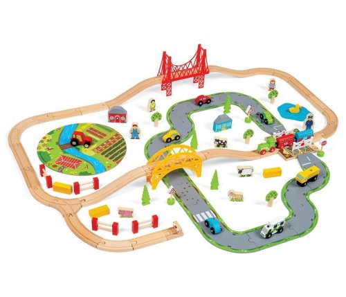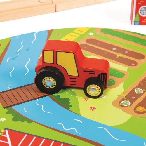 Tento hrací set je ideálnym prepojením drevenej vláčikodráhy a autodráhy Bigjigs. Vláčikodráha prirodzene nadväzuje na cesty pomocou mosta a prejazdu ako v našom bežnom dopravnom svete. Okolie dopĺňa a skrášľuje miestna farma, budovy, stromy a autíč ka . koordináciu