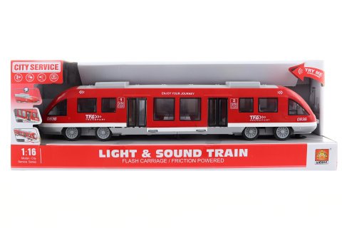 Plastový vlak na batérie. Vlak vydáva zvuky a svieti. Rozmery cca 44,5 x 5,8 x 9 cm. Napájanie na 3 AG13 batérie (sú súčasťou). Rozmery balenia cca 48 x 11 x 16,5 cm. Vek 3+