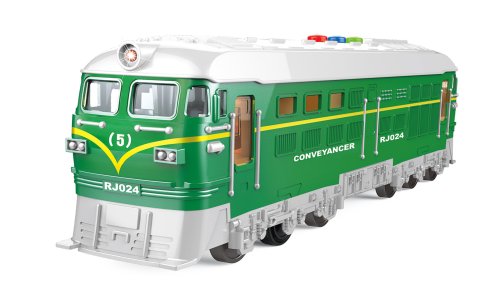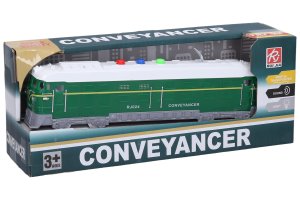 Vlak na zotrvačník s efektmi. Veľkosť 23 cm. Vydáva svetelné a zvukové efekty. Aktivácia tlačidlami na streche (zvuky vlaku a železnice). Batéria 3xAG13, súčasťou balenia.