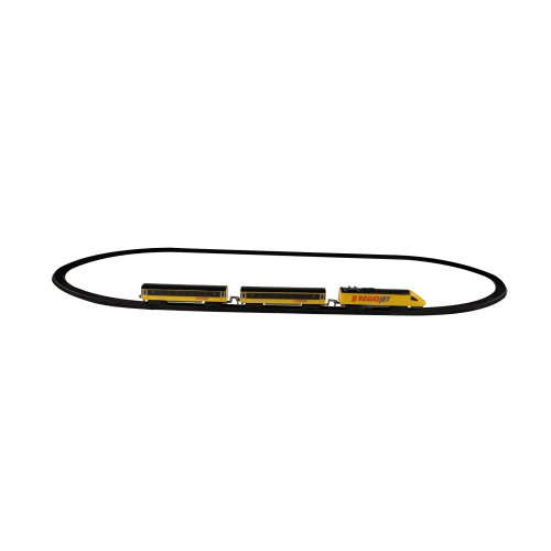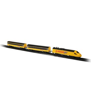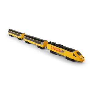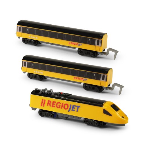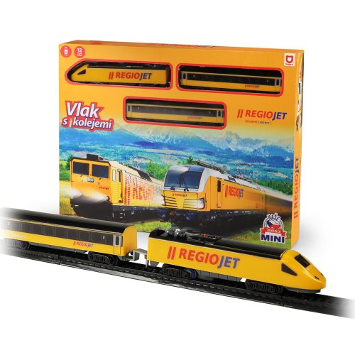 Milujete cestovanie vlakom? Tak zostavte koľaje, postavte na ne lokomotívu, pripojte vagóny a nahor za dobrodružstvom! Originálny žltý vlak RegioJet od Student Agency obsahuje žltú lokomotívu a 2 žlté vagóniky, 8 zahnutých a 4 rovné koľaje. Je možné vytvoriť koľajisko až do veľkosti 96 x 58 cm. Rozteč koľají je 1,4 cm. Lokomotíva meria na dĺžku 14 cm a vagón 13,5 cm. Lokomotíva jazdí na 1 ks AA batérie (nie je súčasťou), na streche lokomotívy vypínačom ON/OFF (zapnuté/vypnuté) uvediete vlak do chodu. Vlak RegioJet MINI je možné kombinovať s vlakom Pendolino MINI a Slovenskej dráhy MINI.