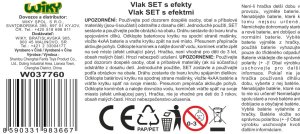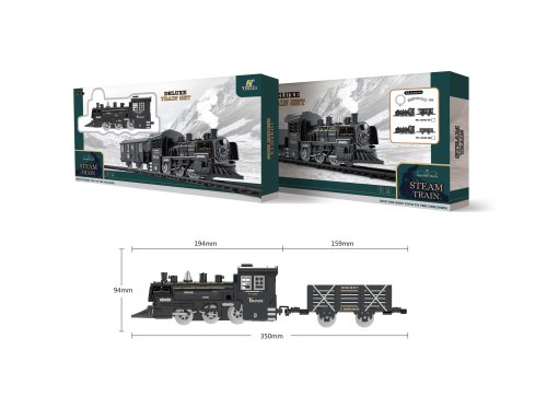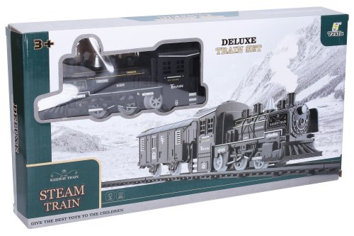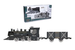 Vlak set. Rozmery železnice 75x75 cm, veľkosť mašinky 19,5 cm, vagónu 15,5 cm. Svetelné, zvukové a dymové efekty. 4xAA batérie do mašinky nie sú súčasťou. Prepínač ON/OFF na ľavej strane mašinky. Súčasťou mašinka, 1 vagón, 6 zahnutých koľajníc, nádobka na vodu. Nádržka na vodu pod strieborným komínčekom.