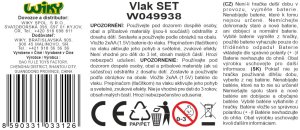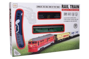 Vlak trať s efektmi. Rozmery zostavenej trate 106x106 cm. Vydáva svetelné a zvukové efekty. Schéma spojenia vlakov a spojenie trate sa nachádza na obale. 2xAA batérie, nie sú súčasťou balenia.