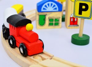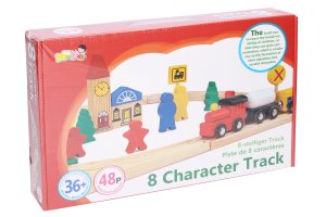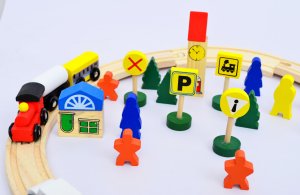 Vlaková dráha set drevo 48ks. Obsahuje drevené koľaje, figúrky, vláčik s vagónikmi pripojiteľné pomocou magnetu, auto, budovu, dopravné značky.
