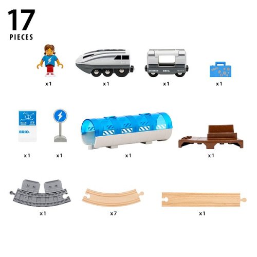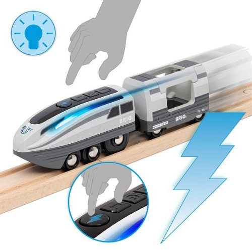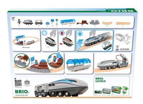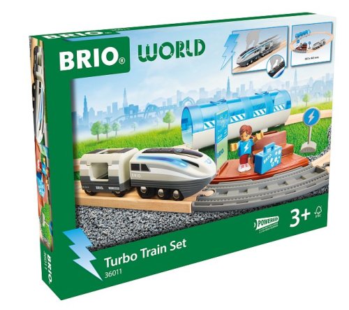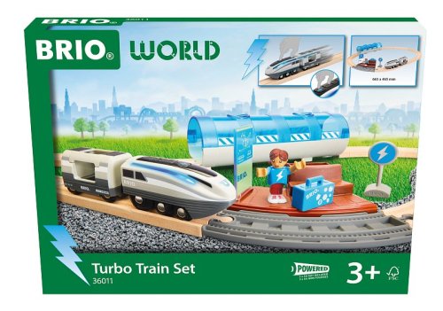 Preháňajte sa po koľajniciach s vlakovou súpravou 36011 Turbo. Stlačte tlačidlo turbo a tento vláčik na batérie sa stane najrýchlejším vlakom vo svete BRIO. Turbo zapnete na 5 sekúnd a biele svetlá na boku lokomotívy sa počas jazdy zmenia na chladne modrú farbu. Zvištite po koľajniciach, prejdite tunelom a potom zastavte na nástupišti v stanici, aby ste nechali cestujúcich vystúpiť. Všetky hračky BRIO World je možné vzájomne kombinovať a vytvoriť tak plne prispôsobiteľný svet, ktorý podporuje detskú kreativitu. Je možné vymyslieť nekonečné množstvo kombinácií nápaditých hier a táto hracia súprava sa k nim dokonale hodí. Stačí si vybrať jednu časť zo sady a začať stavať svoj vlastný svet. Hra na železnici pomáha deťom pochopiť a spoznať svet okolo seba zábavnou a nezabudnuteľnou formou a zároveň rozvíja jemnú motoriku. Sada 36011 Turbo vlak sa skladá zo 17 dielov: 1x lokomotíva s turbo tlačidlom, 1x vagón, 8x drevené vlakové koľaje, 1x nástupište, 1x koľajnice na nástupište, 1x tunel, 1x panáčik a niekoľko ďalších doplnkov. Batérie: 2 x AA, nie sú súčasťou. Certifikácia FSC®: FSC 100%. Rozmery balenia: 27 x 36,5 x 5,5 cm. Rozmery zloženej dráhy: 8,8 x 66,3 x 46,7 cm. Vek: 3+