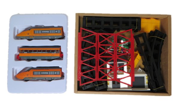 Vysokorýchlostné vlaková súprava Express. Set obsahuje vlak s vozňami, stromy s podstavci, lampu- návestidlo, signalizáciu, koľaje, most, staničnej budovu (celkom 56ks). Celková dĺžka trate 396,5 cm.