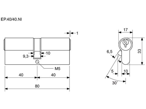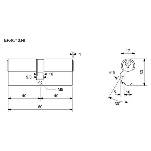 Stavebná 5stavítková vložka. Materiál vložky a kľúčov: mosadz Povrchová úprava: matný nikel (NI) Možnosť spoločného uzáveru - „SU“ - cena mimo uvedené rozmery nižšie, viď Katalóg dielov.