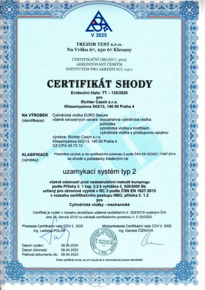 Obojstranná bezpečnosťou 6-stavítková vložka Richter EURO Secure ES.30/35 BSZ.NI je vyrobená s odolnosťou proti odvŕtaniu a nedeštruktívnej dynamickej metóde. Ochranu proti odvŕtaniu tvorí 6 prvkov z kalenej ocele . Skladá sa z 5 kolíkov a 1 stavítka. Predĺžené kľúče k vložke sú dodané v počte 6ks. Tiež môžete využiť spoločný uzáver SU , ktorý vám umožní zjednotiť kľúč pre vchodové dvere, vstupné brány a dielňu. Poskytne vám výber až zo 40 000 možných kombinácií kľúča .