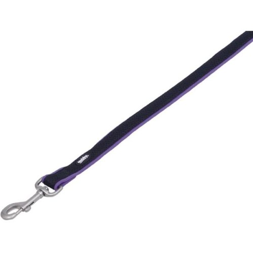 Vodítko je vyrobené z odolného čierneho nylonu so vzorom sieťky podšitého farebným neoprénom. Mäkká rukoväť zaisťuje pohodlný úchop. Karabína je z matného kovu striebornej farby. Hmotnosť (cca): 100 g Materiál: nylon, neoprén, kov. Veľkosť: XS–S Rozmery (cca): dĺžka 120 cm, šírka 1,5–2 cm Farba: čierna, fialová