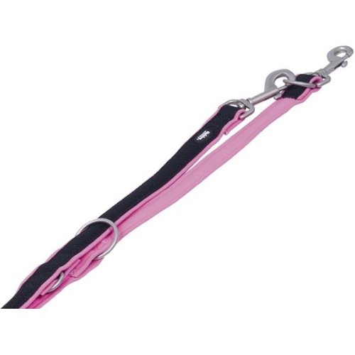 Vodítko je vyrobené z odolného čierneho nylonu so vzorom sieťky podšitého farebným neoprénom. Mäkká rukoväť zaisťuje pohodlný úchop. Karabíny a prepínacie krúžky sú z matného kovu striebornej farby. Prepínacie vodítko je možné nastaviť na 3 rôzne dĺžky a celkovo meria 2 metre. Hmotnosť (cca): 310 g Materiál: nylon, neoprén, kov. Veľkosť: L–XL Rozmery (cca): dĺžka 200 cm, šírka 2,5–3,5 cm Farba: čierna, ružová