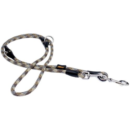 Prepínacie vodítko z veľmi pevného lana je vhodné pre stredné a veľké plemená. Spoje sú zvarené, prešité a zabezpečené koženou krytkou. Po dĺžke lana je niekoľko zváraných krúžkov, pomocou ktorých možno vodítko predlžovať a skracovať podľa potreby. Vďaka koženým prvkom sa vodítko hodí aj ku koženým obojkom. Rozmery: dĺžka 240 cm Ø 12 mm Farba: hnedá