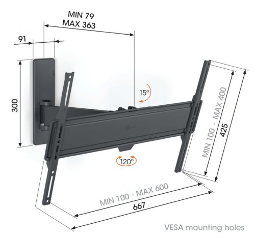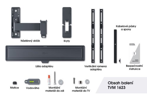 Nástenné rameno s náklonom pre TV s uhlopriečkou 40-77 palcov S týmto nástenným držiakom televízora QUICK Full-Motion môžete televízor sledovať pohodlne, nech ste kdekoľvek v miestnosti. Držiak sa môže otáčať až o 120 ° a nakláňať až o 15 °. Inštalácia je veľmi jednoduchá. Televízor môžete pekne a bezpečne pripevniť na stenu v max. 30 minút. TVM 1623 je vhodný pre televízory s uhlopriečkou 40 až 77 palcov a hmotnosťou do 35 kg.