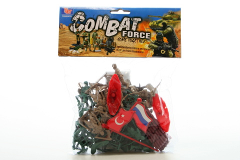 Plastoví vojačikovia v sáčku, obsahuje aj vlajky a zátarasy. Rozmer balenia cca 24 x 17 cm. Vek 3+
