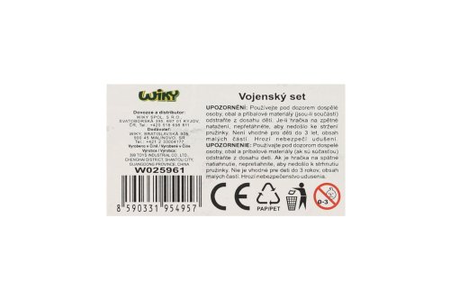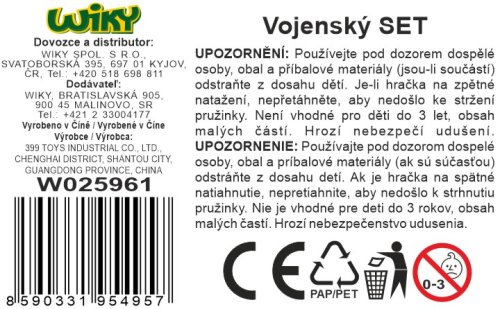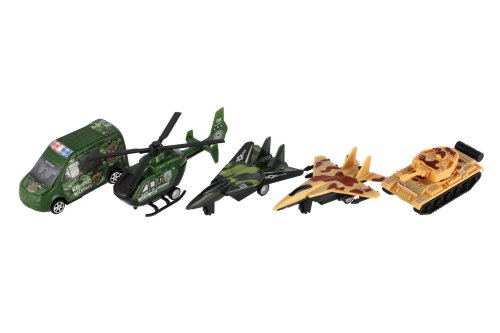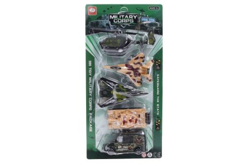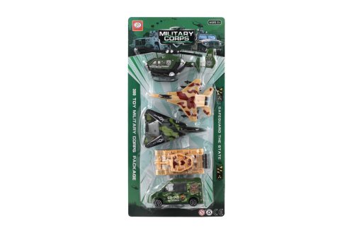 Vojenský set. Na spätné natiahnutie a voľné kolesá. Veľkosť vrtuľníka 16,5 cm. Súčasťou vrtuľník, 2 stíhačky, tank, auto.