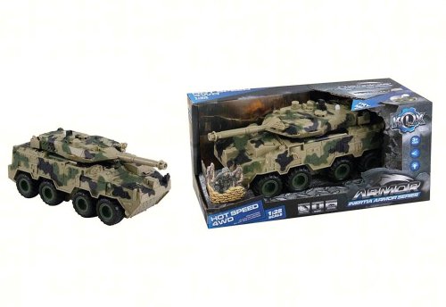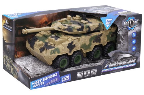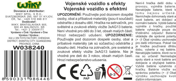 Vojenské vozidlo. Rozmery 25x11x10 cm. Na zotrvačník. Svetelné a zvukové efekty. 3xAG13 batérie súčasťou.