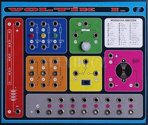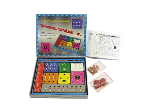 Stavebnica VOLTÍK I. umožňuje zostaviť podľa jednoduchých návodov najmenej 35 elektronických modelov bez spájkovania s farebnými svetielkami a tónovým bzučiakom.