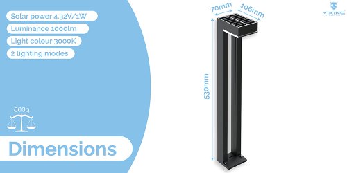 Technické špecifikácie svetla: Model: Vonkajšie solárne LED svetlo Viking SR07 Svietivosť: 1000 lm Farba svetla: 3000K, Ra>70 Typ svetla: LED (OSRAM) 2835, 4ks Doba osvetlenia za nevhodných podmienok: >10 dní Režim ovládania: •tlačidlo, zapnutie/vypnutie stlačením na 1 (2H) + 80% (1H) + 60% (1H) + 40% (1H) + 20% do svitania •M2: 50% do svitania Indikácia režimu: •Aktivácia režimu M1: blikne raz •Aktivácia režimu M2: blikne dvakrát Technológia: ALS2.3 Ochrana: IP54 Rozmer : IP54 Rozmer