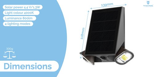 Technické špecifikácie svetla: Model: Vonkajšie solárne LED svetlo s pohybovým senzorom Viking SR39 Svietivosť: 800 lm (ľavé a pravé svetlo, každé 400 lm) Farba svetla: 4000K, Ra>70 Typ svetla: LED 2835, 24ks (ľavé a pravé svetlo, každé 1 dní Režim ovládania (vypínač ON/OFF):