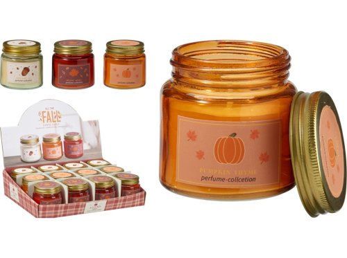 Kompaktná sviečka v skle s viečkom a krásnou jesennou potlačou. Dodáva sa v rôznych vôňach a farbách. Skvelá do malých priestorov, na pracovný stôl alebo ako drobný darček. Tovar je dodávaný v mixe. Doručovaný tovar je vyberaný náhodne a nie je možné vybrať konkrétne prevedenie.