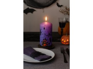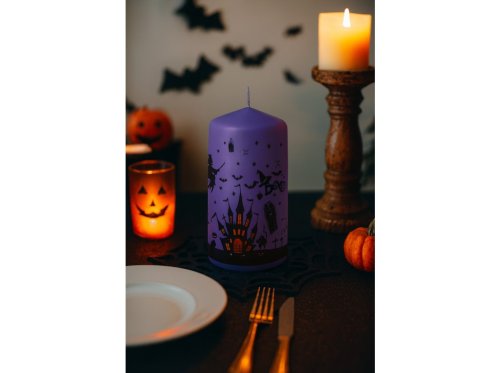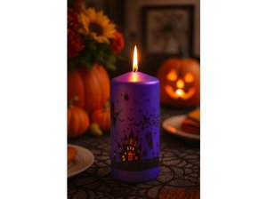 Originálna fialová valcová sviečka s halloweenskym nápisom „Boo“. Výborná na výzdobu domácnosti počas sviatkov duchov. Hodí sa k ďalším doplnkom v tmavých tónoch.